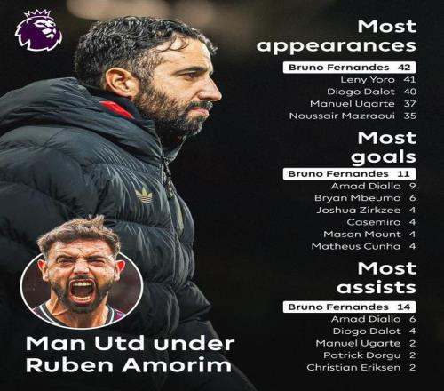 北京时间1月5日,曼联官方宣布解雇球队主帅阿莫林,根据英超官方的统计数据,B费是阿莫林治下曼联在英超当中出场、进球和助攻最多的球员。